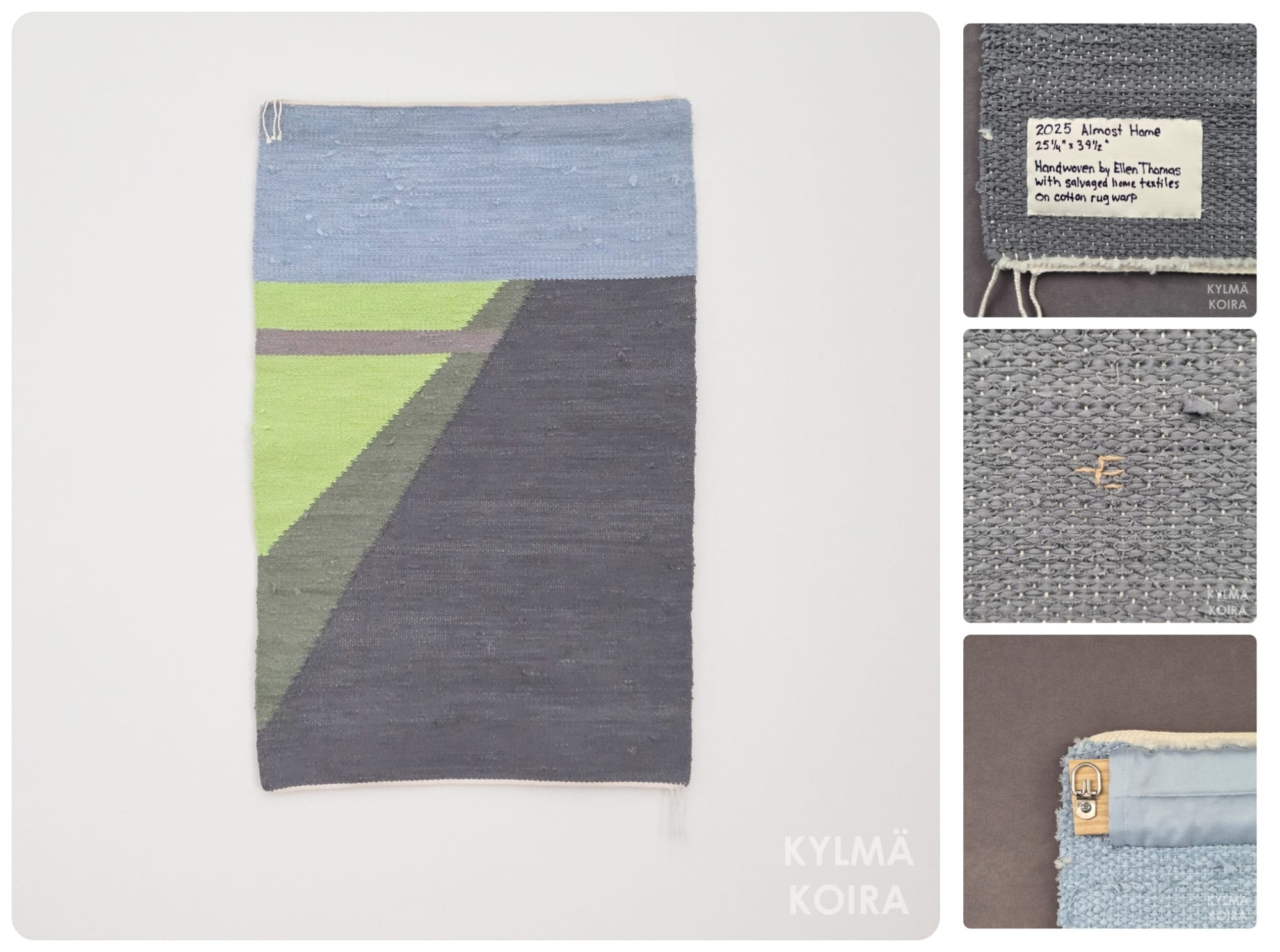 Eagerly anticipating the transition between worldly life and the sanctity of home. Handwoven with salvaged home textile fabrics on undyed cotton rug warp.