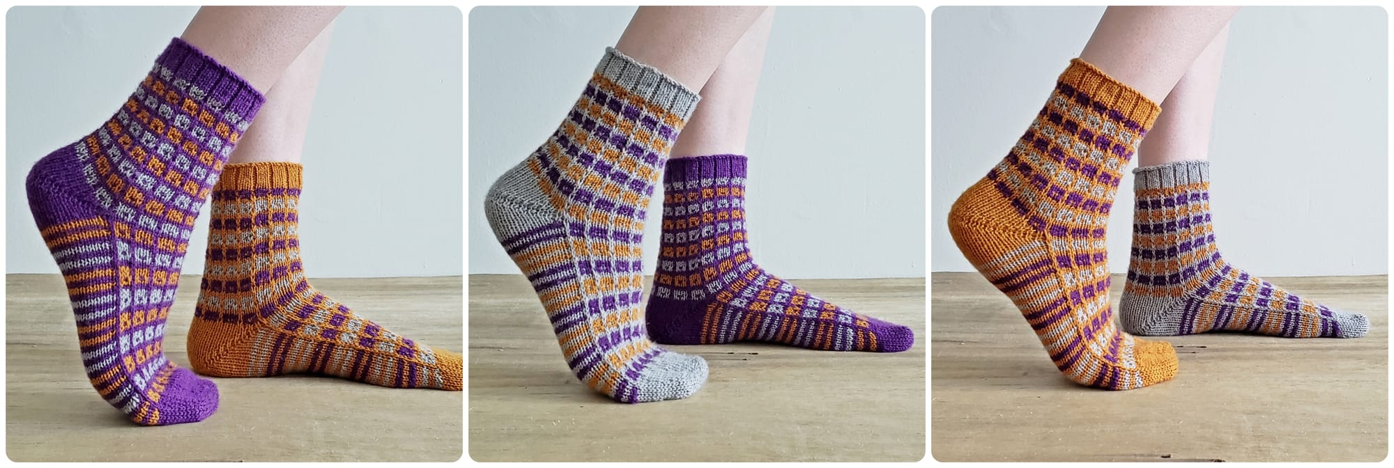 When I was planning the design for my Cubicle Socks Trio pattern, I envisioned a project where you could experiment with color interaction. Rather than knitting a pair of identical, 3-color socks, the pattern allows you to try three different arrangements to explore how placement impacts your perception of the colors.
