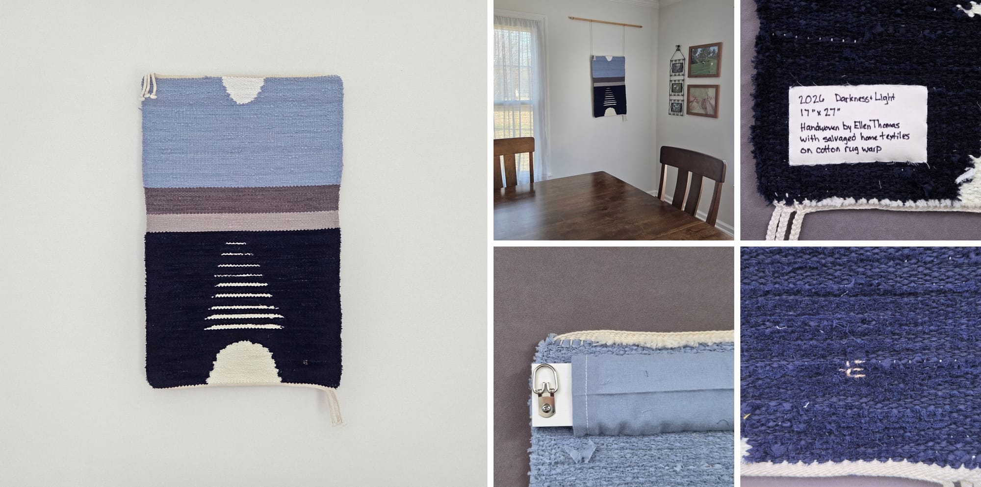 17" wide x 27" long - Handwoven with salvaged home textile fabrics on undyed cotton rug warp. This piece has a hanging pocket and mounting bar.