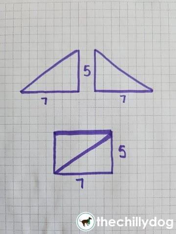 Before I find the area of the triangular bits, here's a quick geometry refresher. If I have two equal-sized right triangles, I can put them together like two puzzle pieces to create a rectangle.