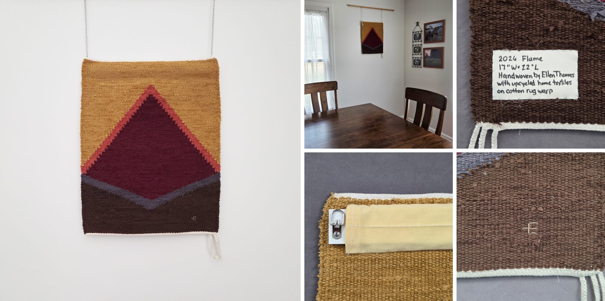 17" wide x 22" long - Handwoven with upcycled poppana (bias cut fabric strips) on undyed cotton rug warp. This piece is ready for display with a hanging sleeve and mounting slat.