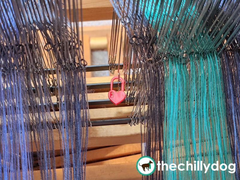 As the warp was wound onto the beam, I inevitably broke a few of the fine threads along the way. Five to be exact. Instead of grumbling each time I heard a thread pop, I grabbed a locking heart stitch marker (a gift from a sweet fiber friend) from my knitting stash and clipped it onto the heddle that would require my attention and re-threading later.