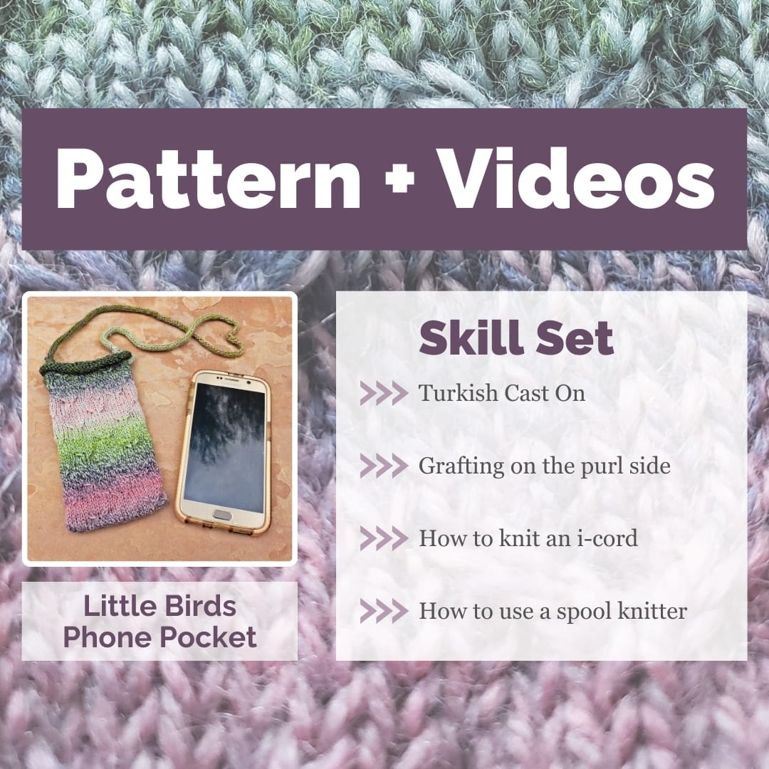 Bundle and Save! We've combined the Little Birds Phone Pocket Pattern with our ad-free video series to help you knit with confidence and keep a little extra jingle in your pocket.