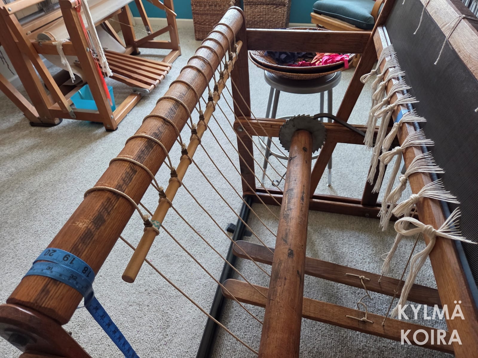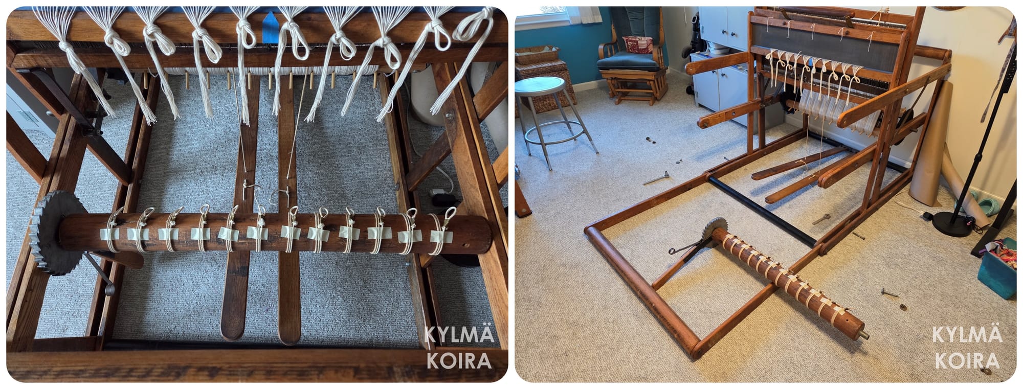 Before sliding the apron onto the cloth beam, something had to be done with Grandpa's ropes. Rather than remove them, I wrapped them around the cloth beam and secured them with masking tape. Next I had to partially disassemble the loom so I could access the cloth beam.