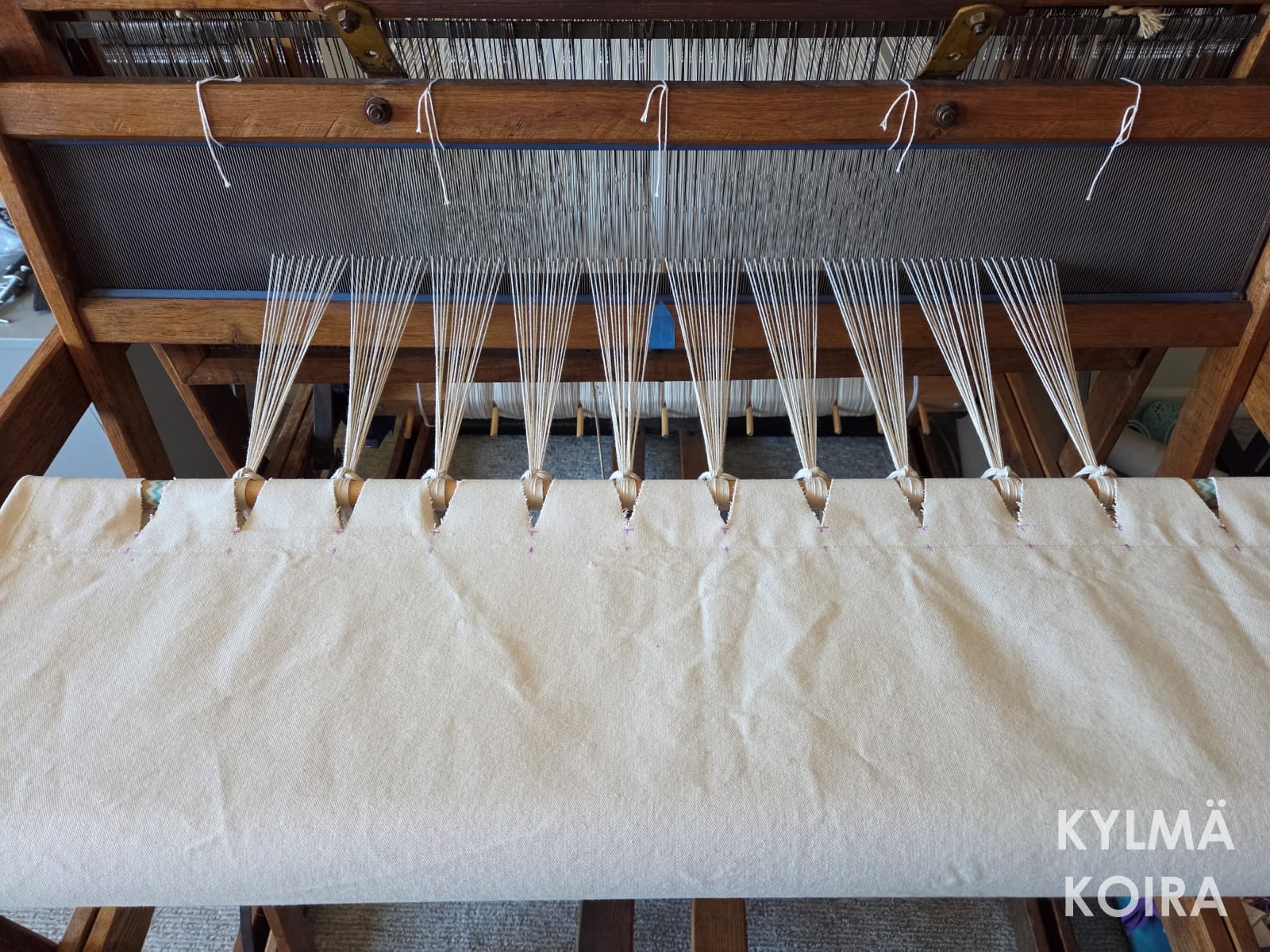 I slid the apron onto the cloth beam, replaced the beam, reassembled the loom and tacked the apron into place. I cut 12 slits along the edge of the apron rod pocket and inserted the apron rod . Finally I was able to tie on the warp. Beautiful!