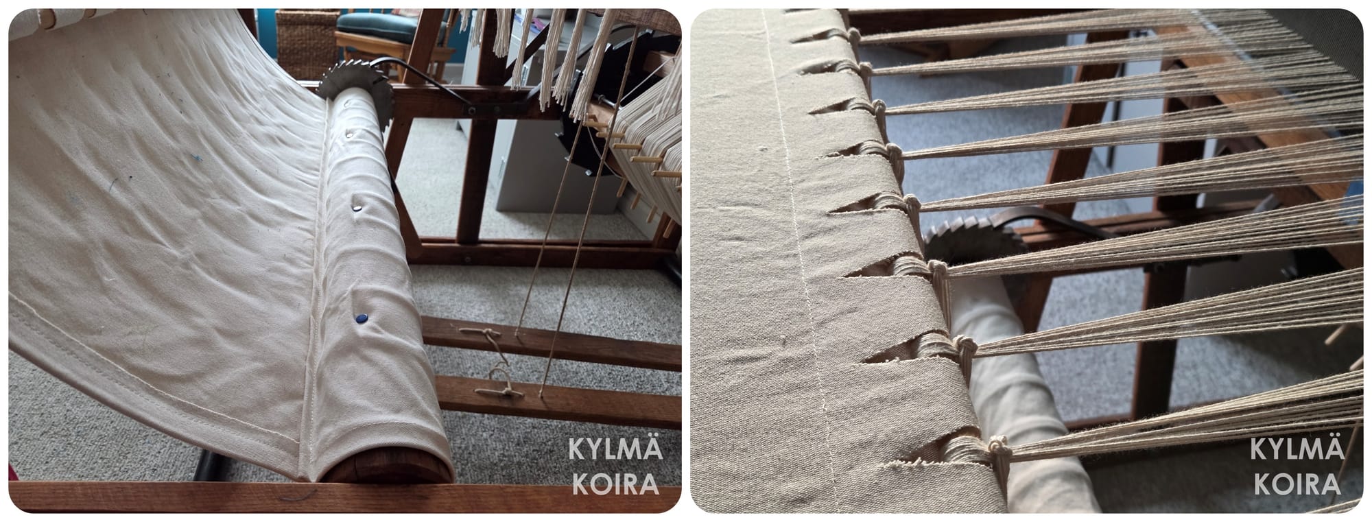 As the woven cloth rolls onto the front beam it shifts slightly to the left or right because of how the ropes wind around the cloth beam. Many looms, including my Leclerc Nilus (seen in the background of the above photo), have a fabric apron connected to the cloth beam to ensure the woven fabric doesn't skew as it advances. I could make an apron for Grandpa's loom. All I would need is a large piece of heavy canvas.