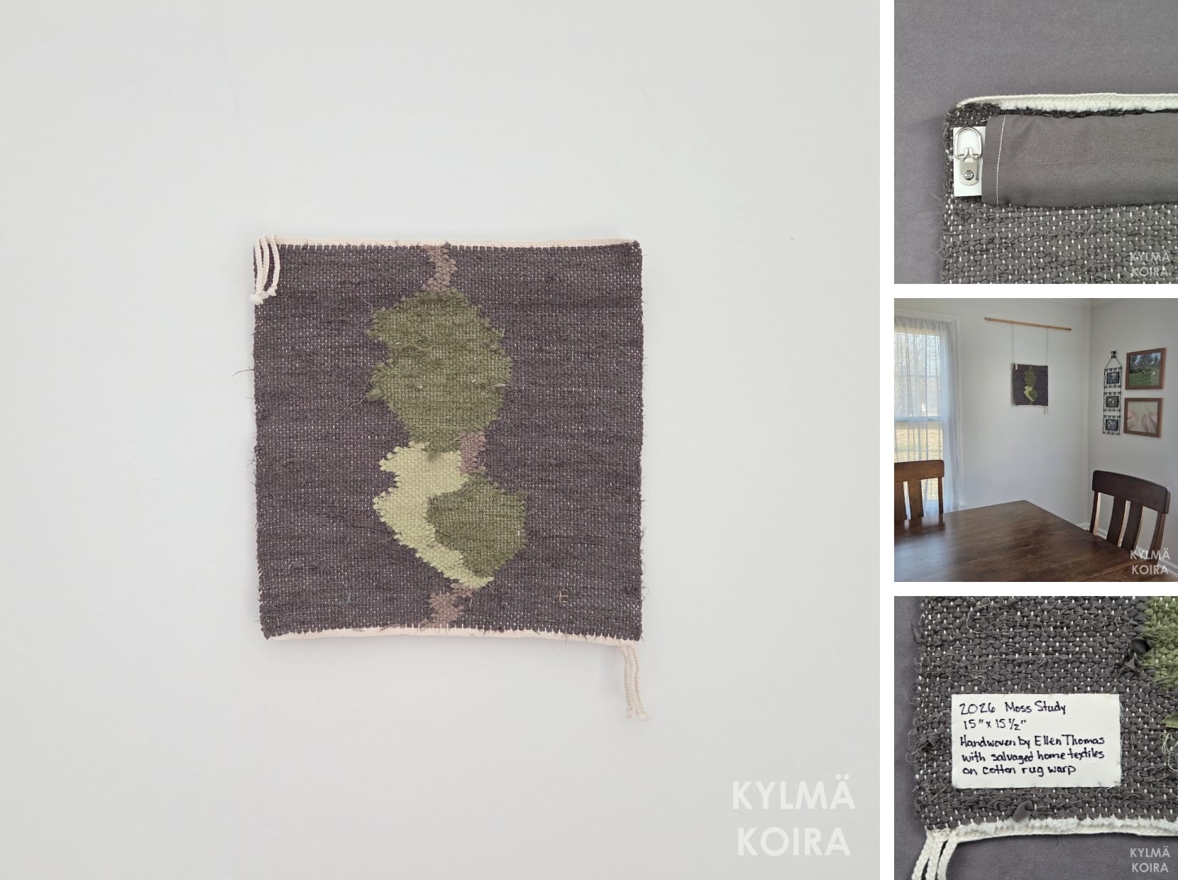 Moss thriving in the cracks on the side of the road. Handwoven with upcycled home textile fabrics on undyed cotton rug warp.