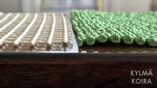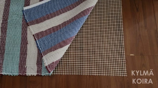 Our home may not have quite as many handwoven rugs as the average Finnish home, but it's getting close. There are rag rugs by the front and back doors, in the bathroom, in my studio and in the hallway. Because the rugs are reversible and don't have any sort of grippy backing, when I place a rag rug on a hard surface, I like to put some sort of grippy pad beneath it to help keep the rug in position.