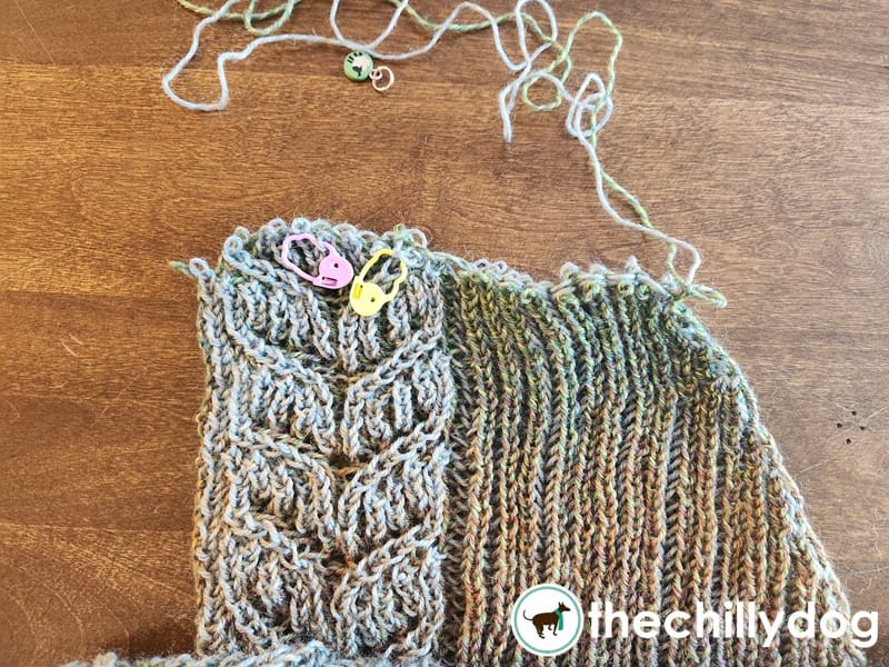 After a good night's sleep and a cup of coffee I was ready to take another look at things so I brought my knitting out to the kitchen table, removed my knitting needles and ripped back to the locking stitch markers that were holding my dropped stitches.