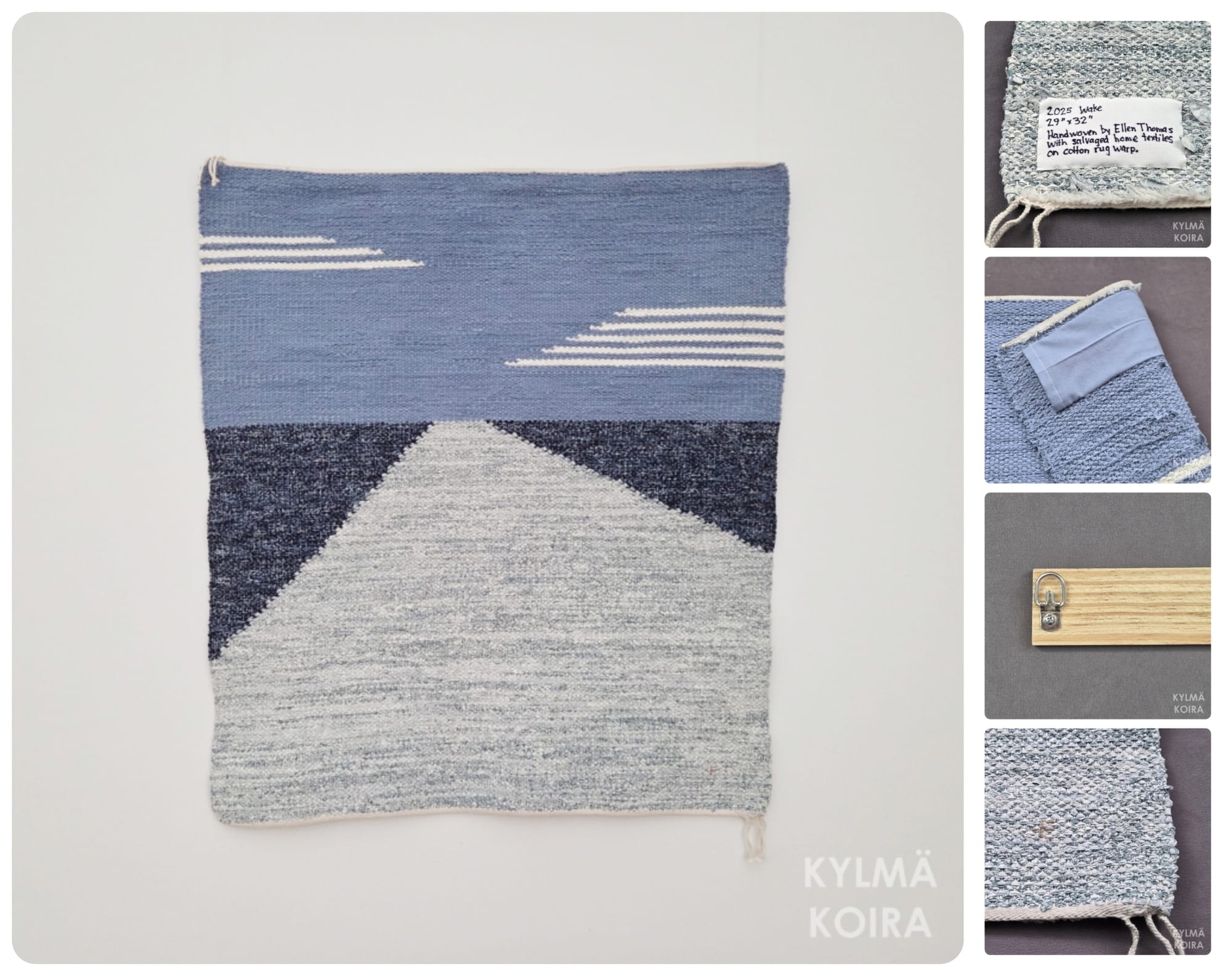 Cruising along and making waves on a clear, summer day. Handwoven with salvaged home textile fabrics on undyed cotton rug warp.